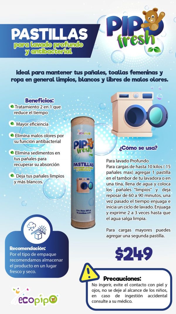 ¿Cómo se usa? Para lavado profundo, para cargas de hasta 10 kilos (15 pañales Max) agregar 1 pastilla en el tambor de tu lavadora o en una tina, llena de agua y coloca los pañales “limpios” y deja reposar de 60 a 90 min, una vez pasado el tiempo enjuaga y exprime 2 a 3 veces hasta que el agua salga limpia. Para cargas mayores puedes agregar una segunda pastilla.